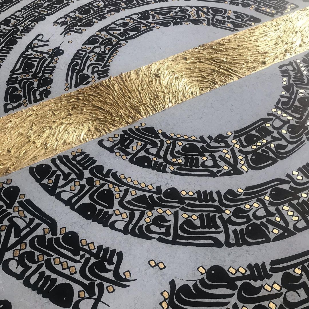 Eclipse is a mesmerizing calligraphy artwork that blends tradition with modern aesthetics. Created using mixed media, including acrylic and gold leaf on canvas, it features intricate circular compositions with a striking golden divide at its core. The interplay of black script and shimmering gold evokes a celestial contrast, much like an eclipse itself. With its harmonious balance and profound symbolism, Eclipse invites the viewer to reflect on duality, unity, and transformation.