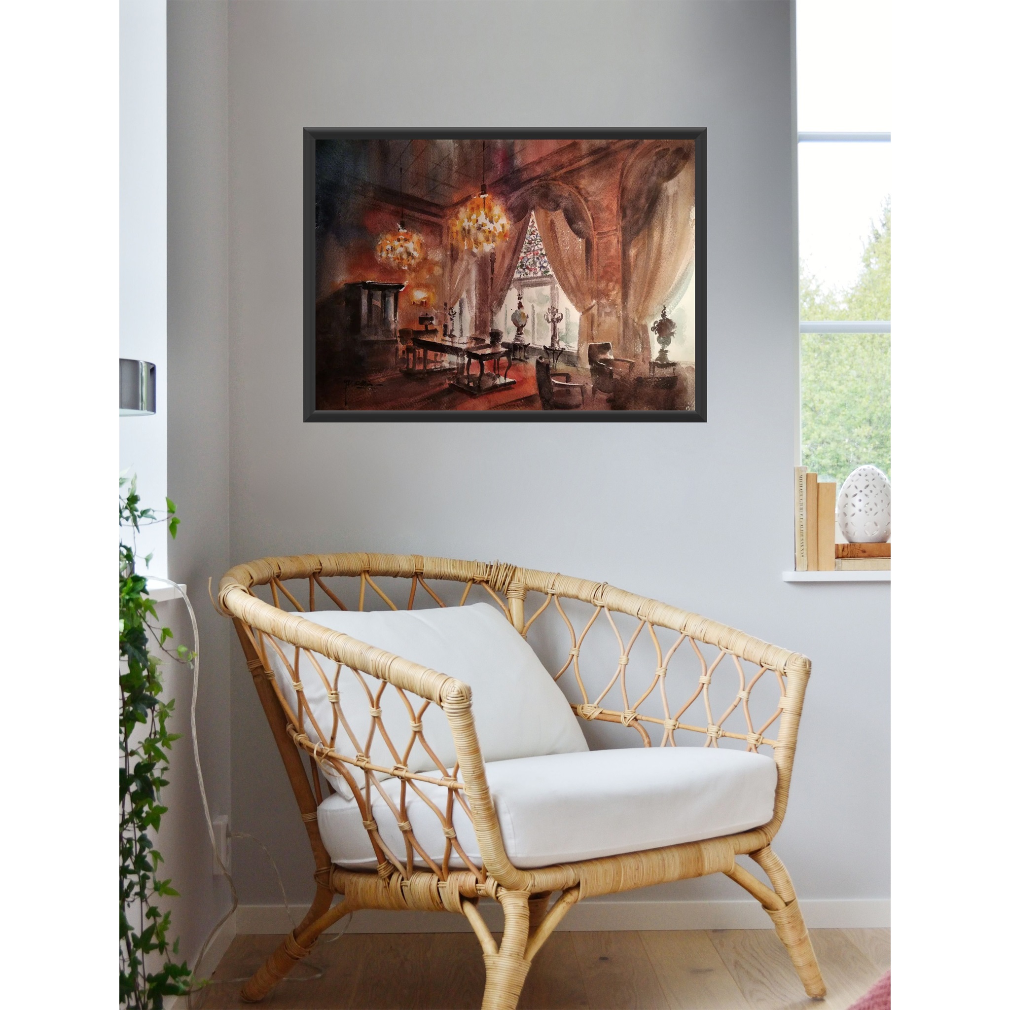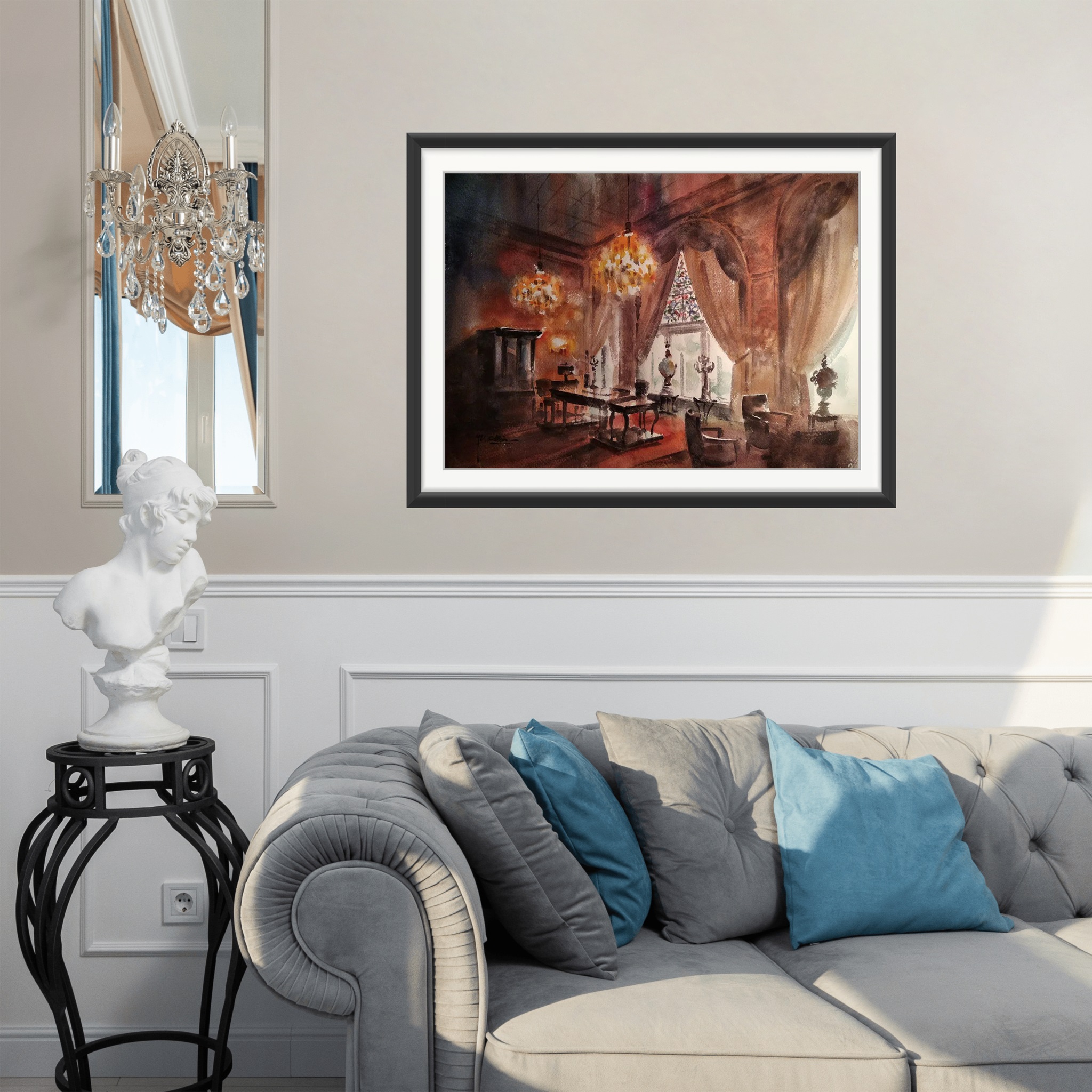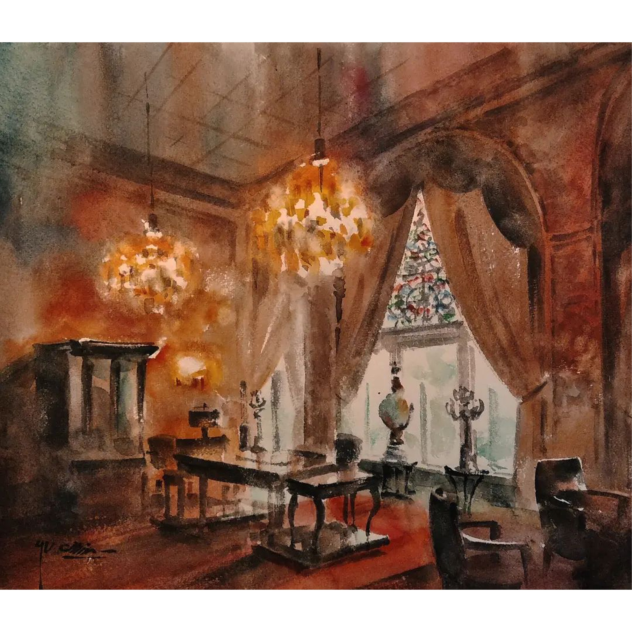 Golestan Palace is a stunning watercolor painting that captures the elegance of Persian architecture. The artwork showcases the palace’s luxurious interior, adorned with grand chandeliers, ornate furniture, and intricate stained-glass windows. The warm color palette enhances the richness of the scene, bringing to life the opulence of Golestan Palace.