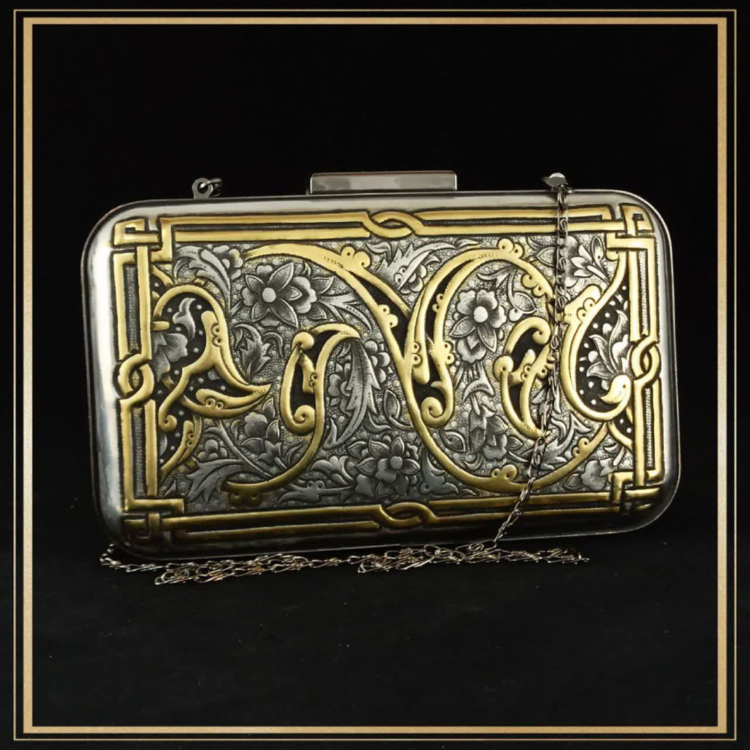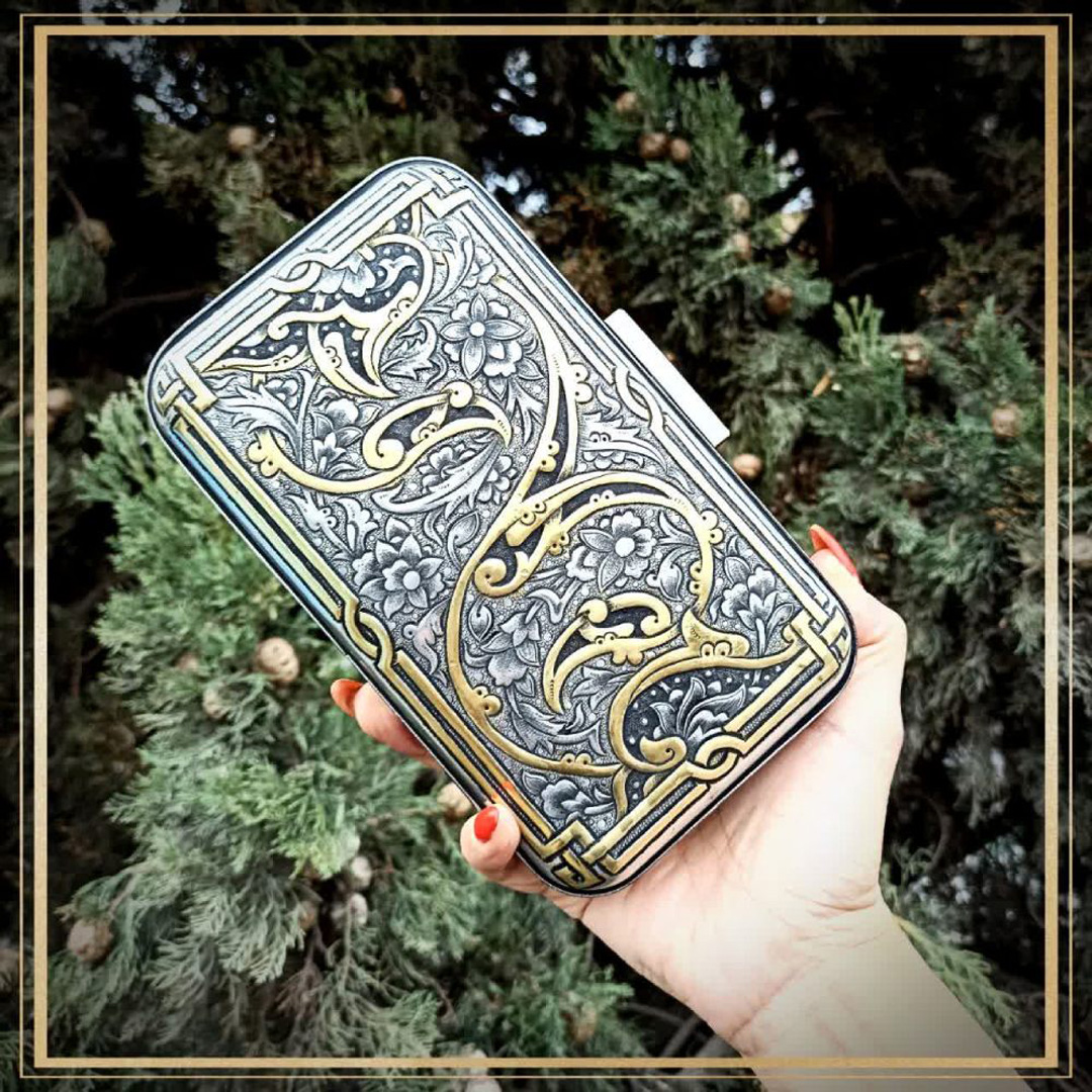 Karun Model Toreutics Bag is a masterpiece of Persian artistry, combining timeless elegance with meticulous craftsmanship. Made of brass and entirely hand-engraved using the traditional toreutics technique, it features intricate floral patterns highlighted with golden details against a silver background. The interior is lined with genuine leather, giving it both durability and refinement.