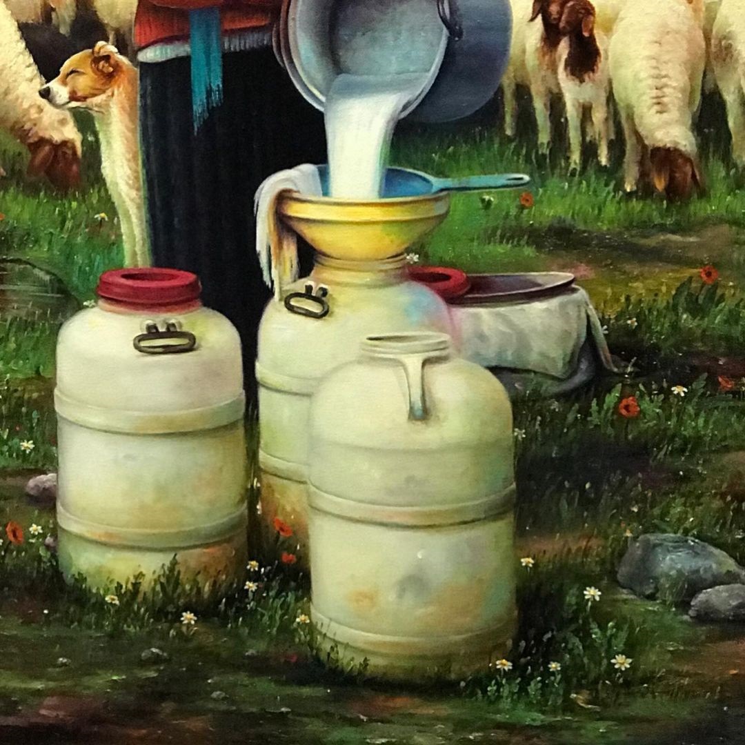 Milk Seller is a stunning oil painting on canvas by Mahmoud Badr. This artwork beautifully captures a rural scene where a milk seller pours fresh milk, surrounded by grazing sheep. The rich colors and fine details bring Milk Seller to life, making it a perfect addition to any collection.