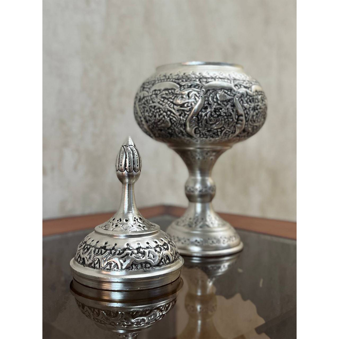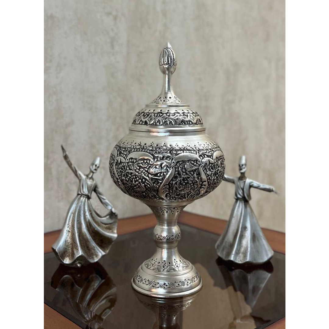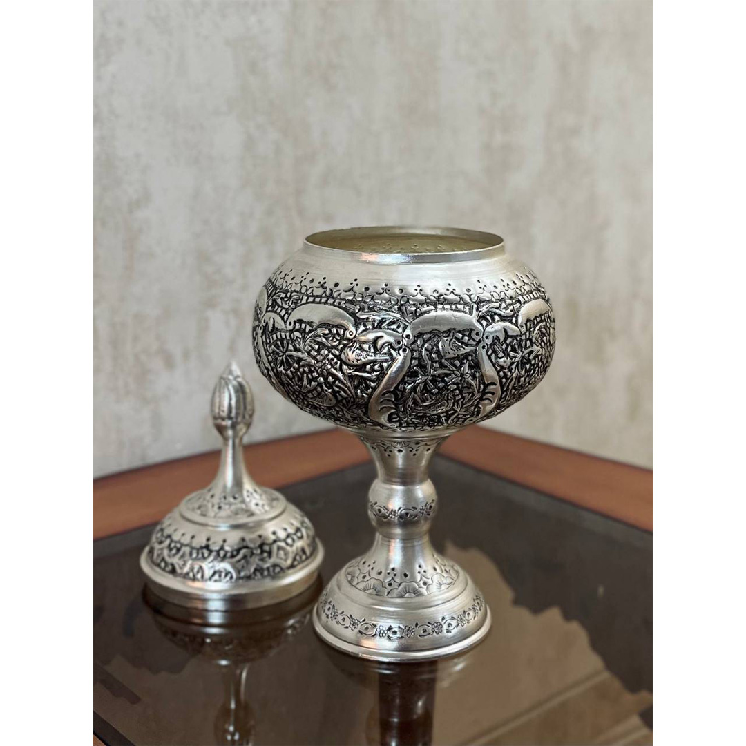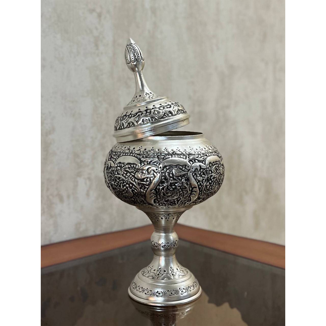 Nightingale Blossom Design Engraved Candy Bowl is a luxurious handcrafted piece made of high-quality copper and beautifully silver-plated to enhance its elegance and durability. Its intricate Nightingale Blossom engraving reflects the charm of traditional Persian metal art, making it both a practical and decorative choice.