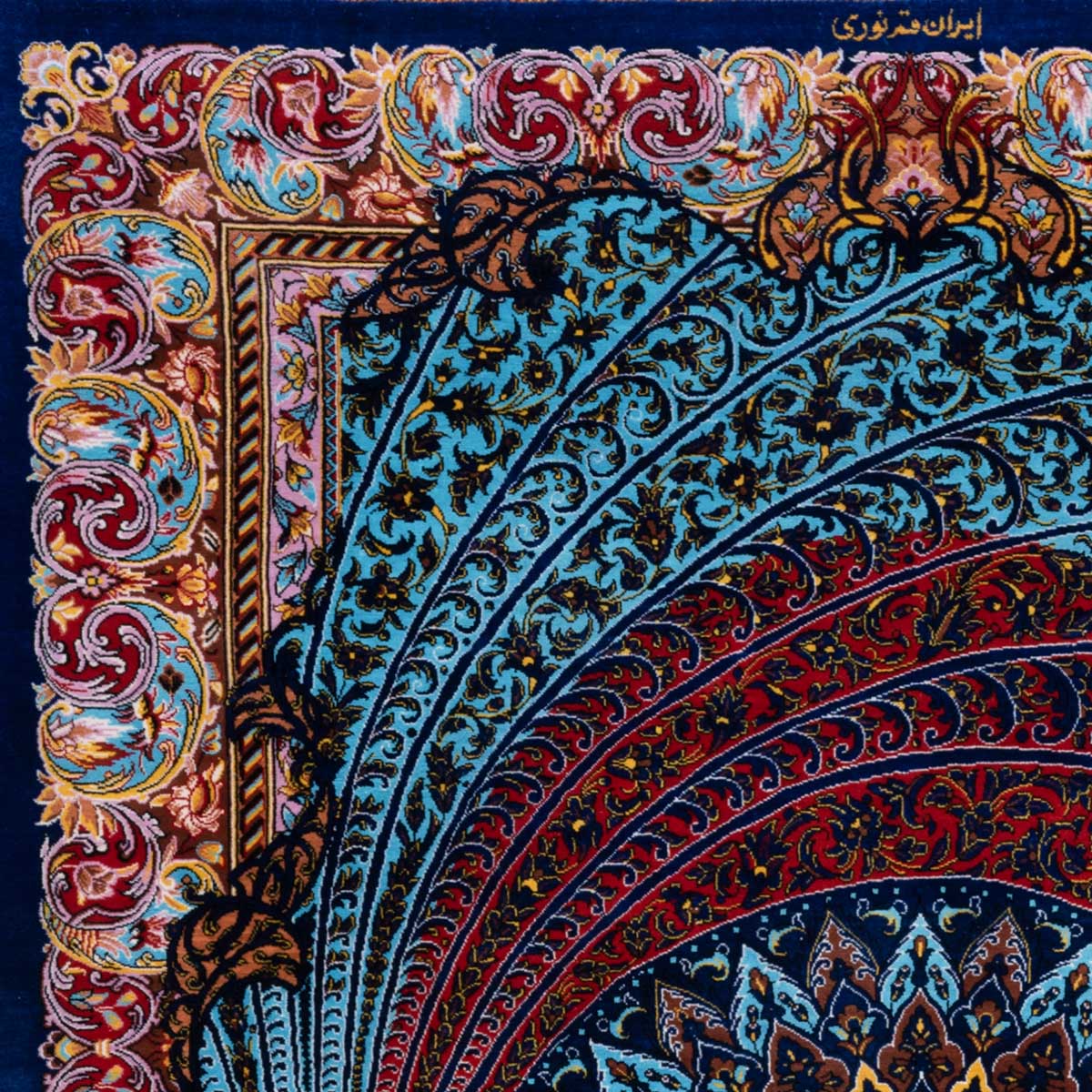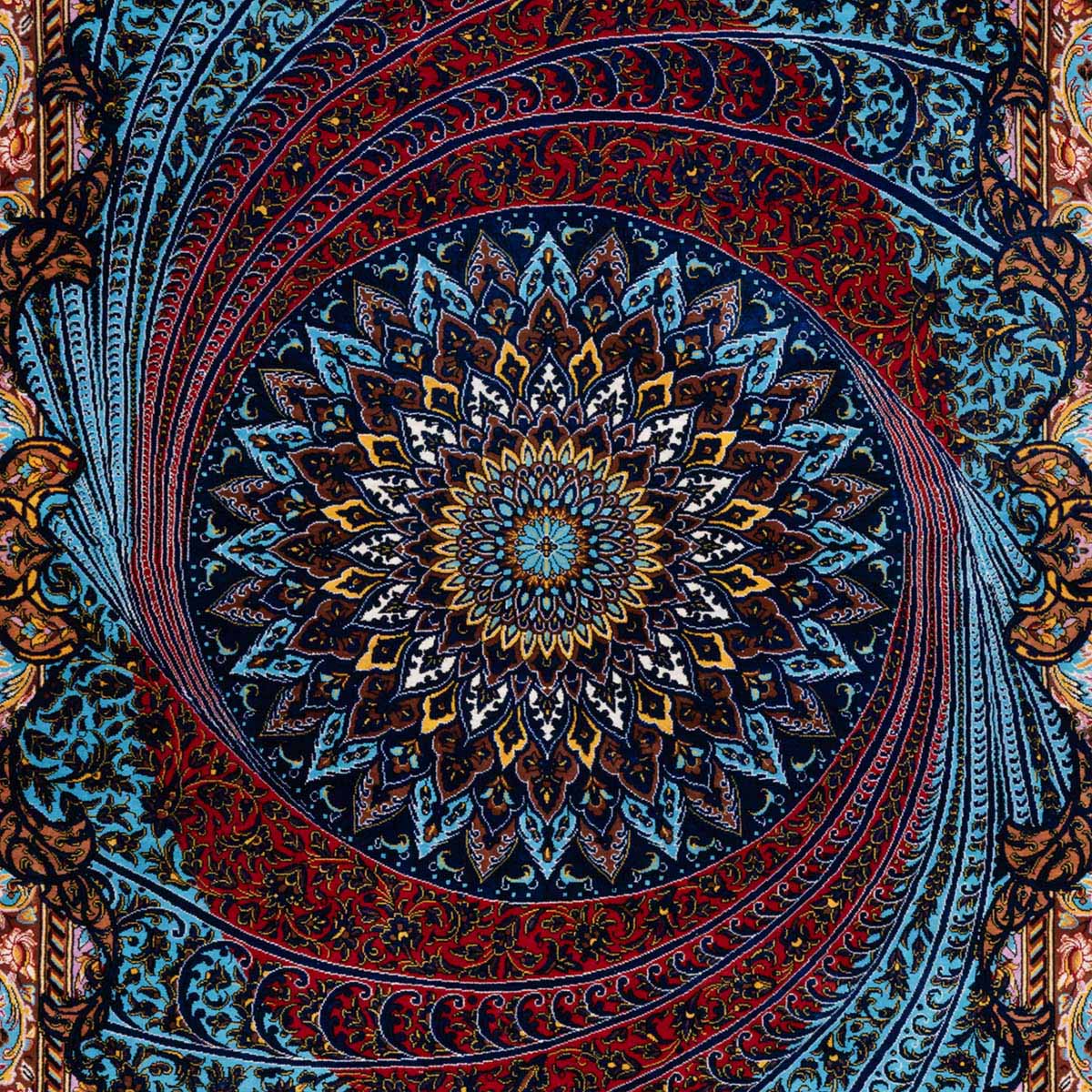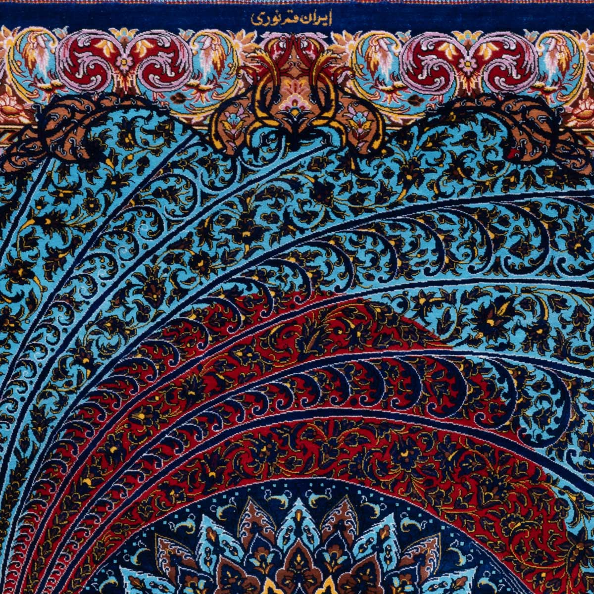 Qom Rug is a true celebration of Persian artistry, featuring a mesmerizing whirlpool pattern centered around a radiant medallion. Handwoven from pure silk in Qom, Iran, this masterpiece showcases intricate floral motifs and an explosion of vibrant colors—from rich blues and reds to golden accents—that create a stunning visual rhythm. Whether displayed on a wall or floor, this Qom Rug brings unmatched elegance and cultural richness to any space.