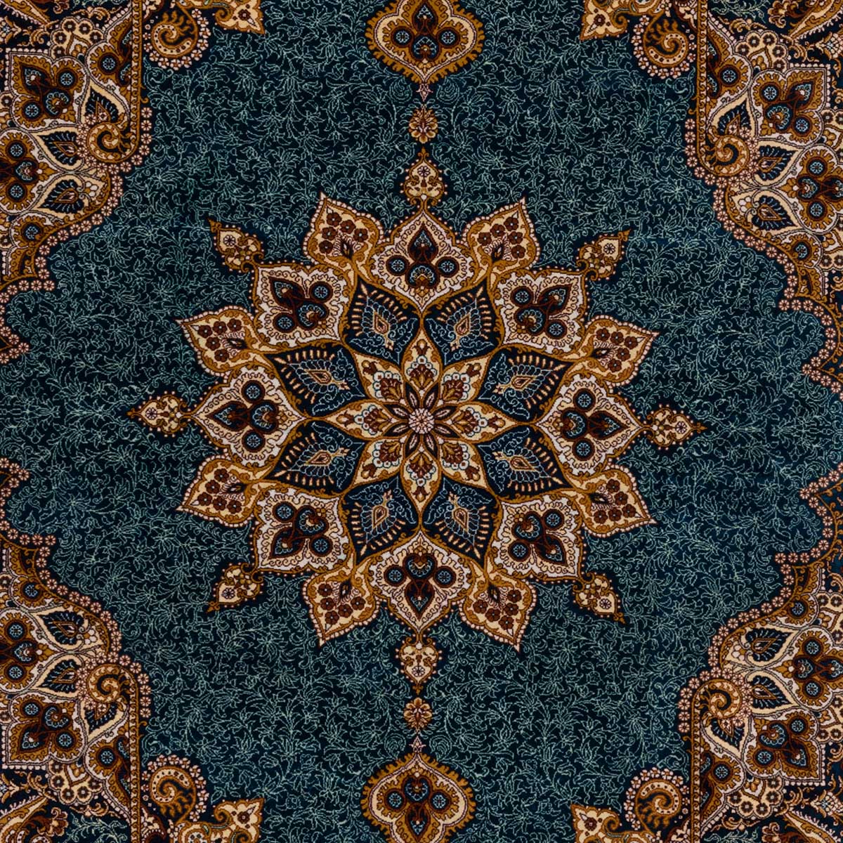 Qom Rug celebrates centuries-old Persian weaving traditions with its fine silk pile and dense knotting that create a remarkably smooth, lustrous surface. This Qom Rug’s central medallion unfolds into intricate floral arabesques, while its rich turquoise and navy fields are framed by cream and brown borders—each hue dyed from natural pigments. Ideal for elevating a formal sitting room or study, this handwoven treasure combines durability with opulent detail, turning any space into a showcase of Persian cultural heritage.