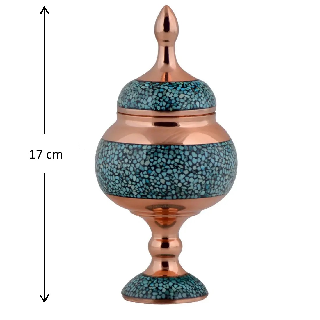 The Shimmer Model Turquoise Inlaying Candy Dish is a finely crafted piece made of copper and natural turquoise. It features premium Neyshabur turquoise, valued for its rich color and durability. Ideal for elegant serving or as a meaningful gift, its detailed craftsmanship and timeless charm make it a unique addition to any collection.