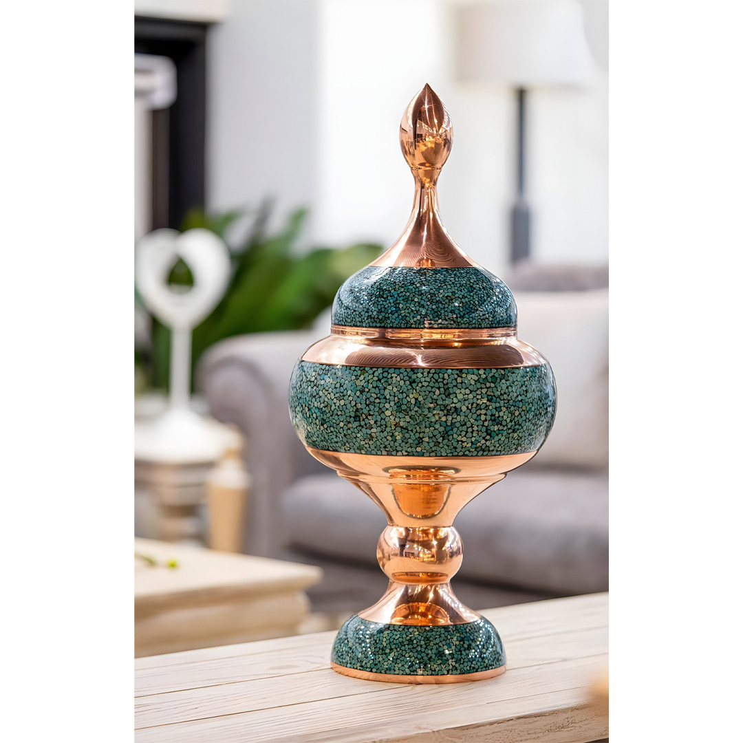 Shimmer model turquoise inlaying candy dish is a dazzling fusion of authentic Iranian art, premium Neyshabur turquoise stones, and high-quality copper. Crafted by skilled Isfahani artisans, each piece features delicately placed turquoise stones sealed with multiple layers of polyester protection for lasting shine and durability. More than just decorative, these candy dishes are functional, perfect for serving sweets or nuts, enhancing home décor, or presenting as an elegant gift.