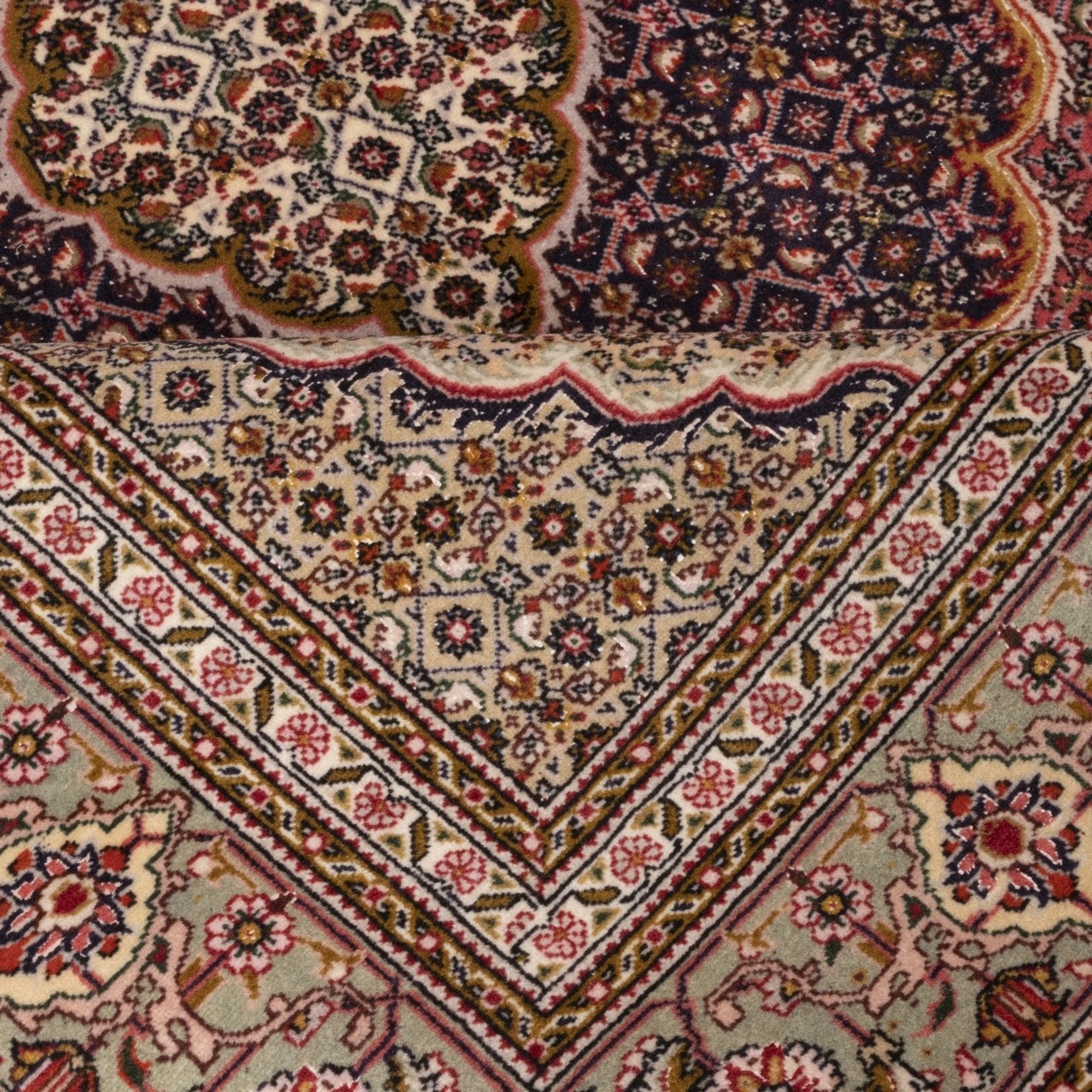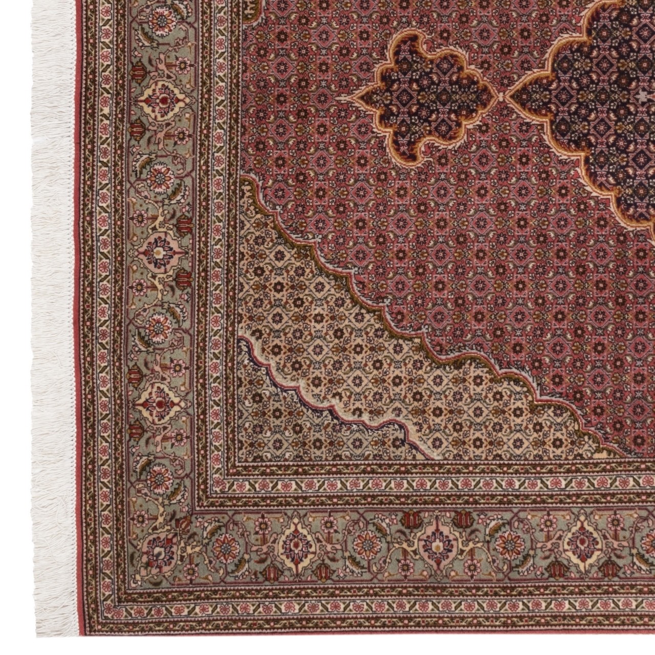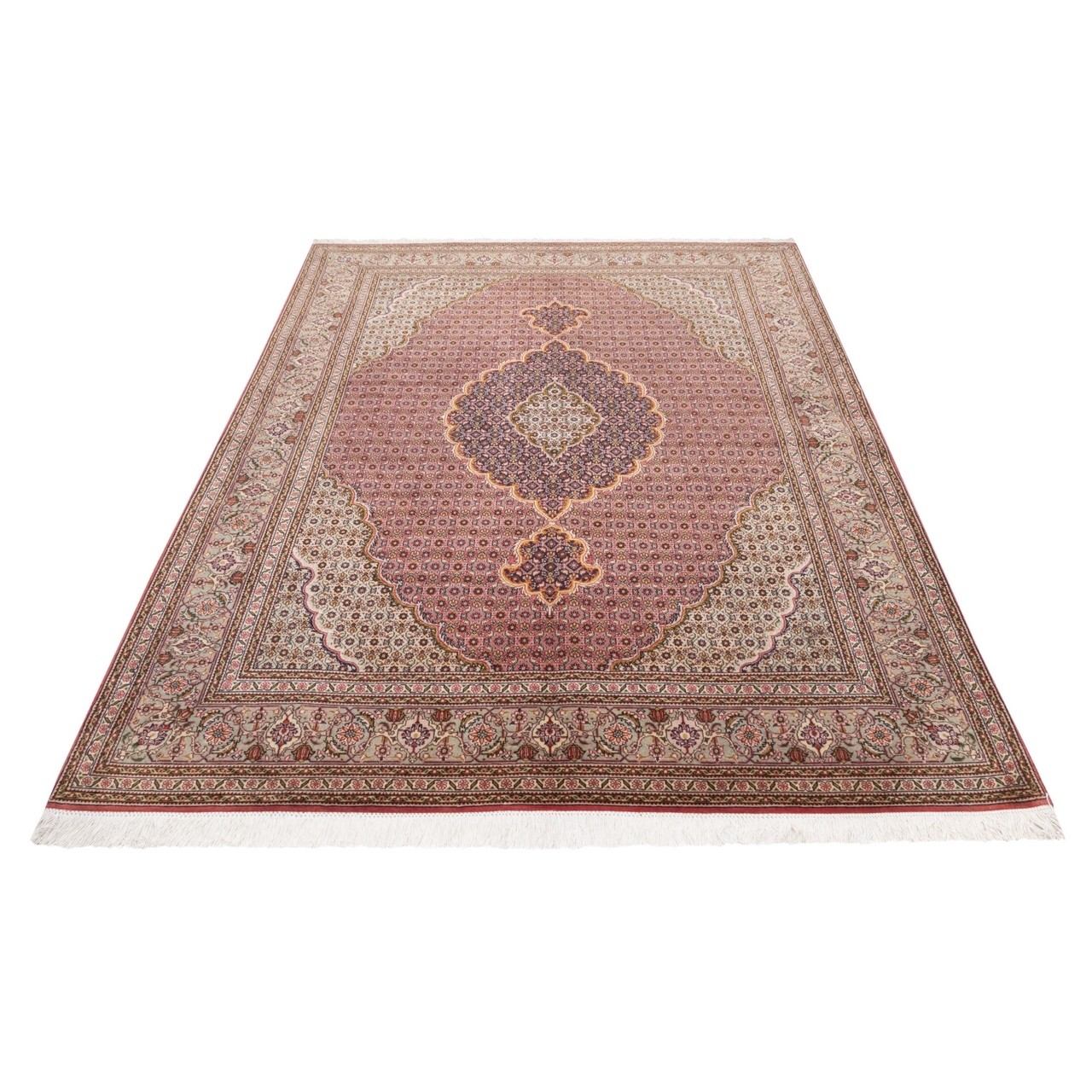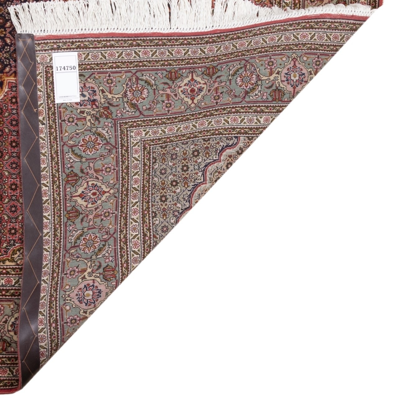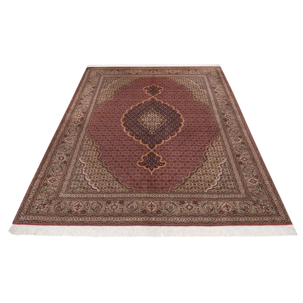 Tabriz Rug with its authentic and intricate design beautifully reflects the elegance of Tabriz craftsmanship. The warm brown background paired with cream borders creates a calm, classic atmosphere, while the fine, detailed patterns bring a sense of heritage and refinement to any space. Crafted from wool and silk on a cotton foundation, it offers both softness and long-lasting durability. If you’re looking for a genuine Tabriz Rug that blends beauty, quality, and traditional Persian artistry, this piece is an exceptional choice.